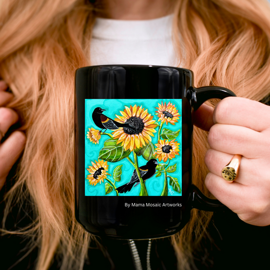 Black Birds Mug - Black Birds On Sunflower from Mama Mosaic Artworks - 15 oz Black Glossy Ceramic