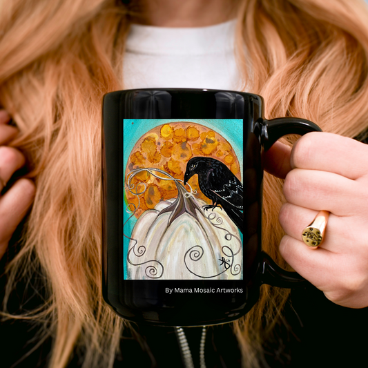 Crow on White Pumpkin from Mama Mosaic Artworks - 15 oz Black Glossy Ceramic Mug