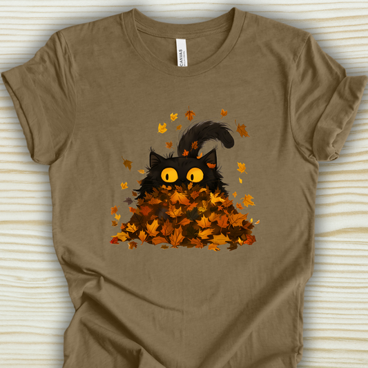 Black Cat TShirt - Black Cat Fall Leaves Unisex Crew