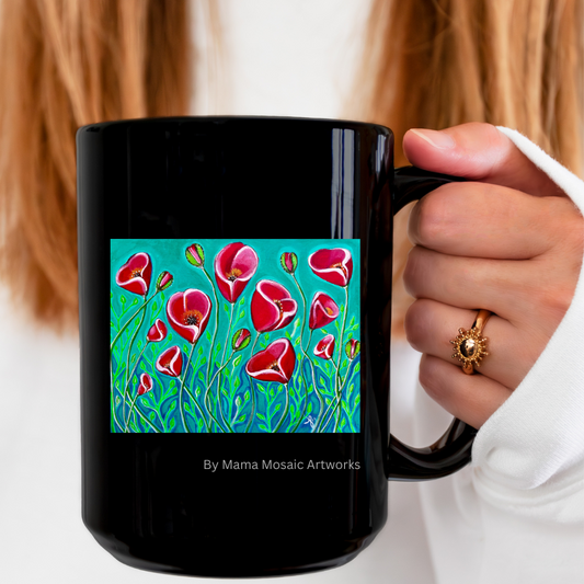 Poppies from Mama Mosaic Artworks - 15 oz Black Glossy Ceramic Mug