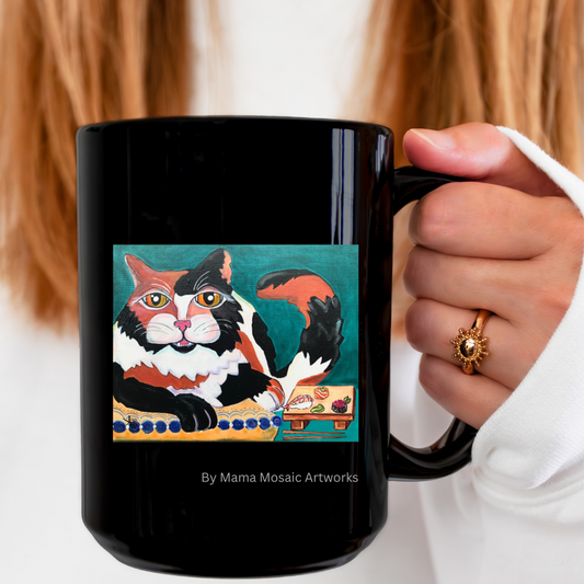 Sushi Cat from Mama Mosaic Artworks - 15 oz Black Glossy Ceramic Mug