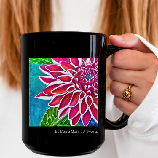 Zinnia Mug - Zinnia from Mama Mosaic Artworks - 15 oz Black Glossy Ceramic