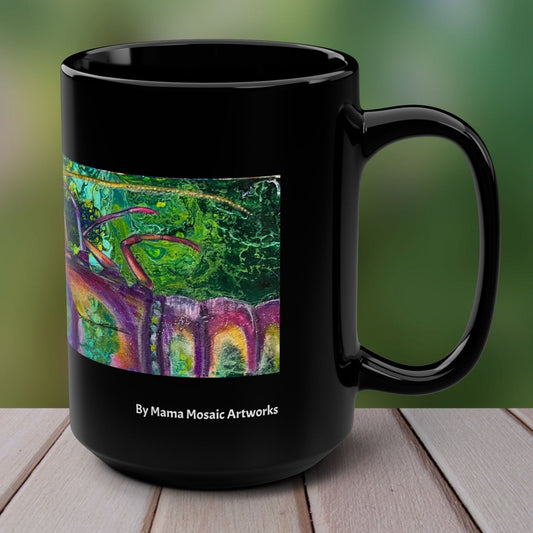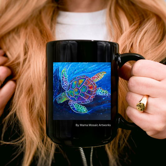Sea Turtle Mug - Flying Turtle from Mama Mosaic Artworks - 15 oz Black Glossy Ceramic