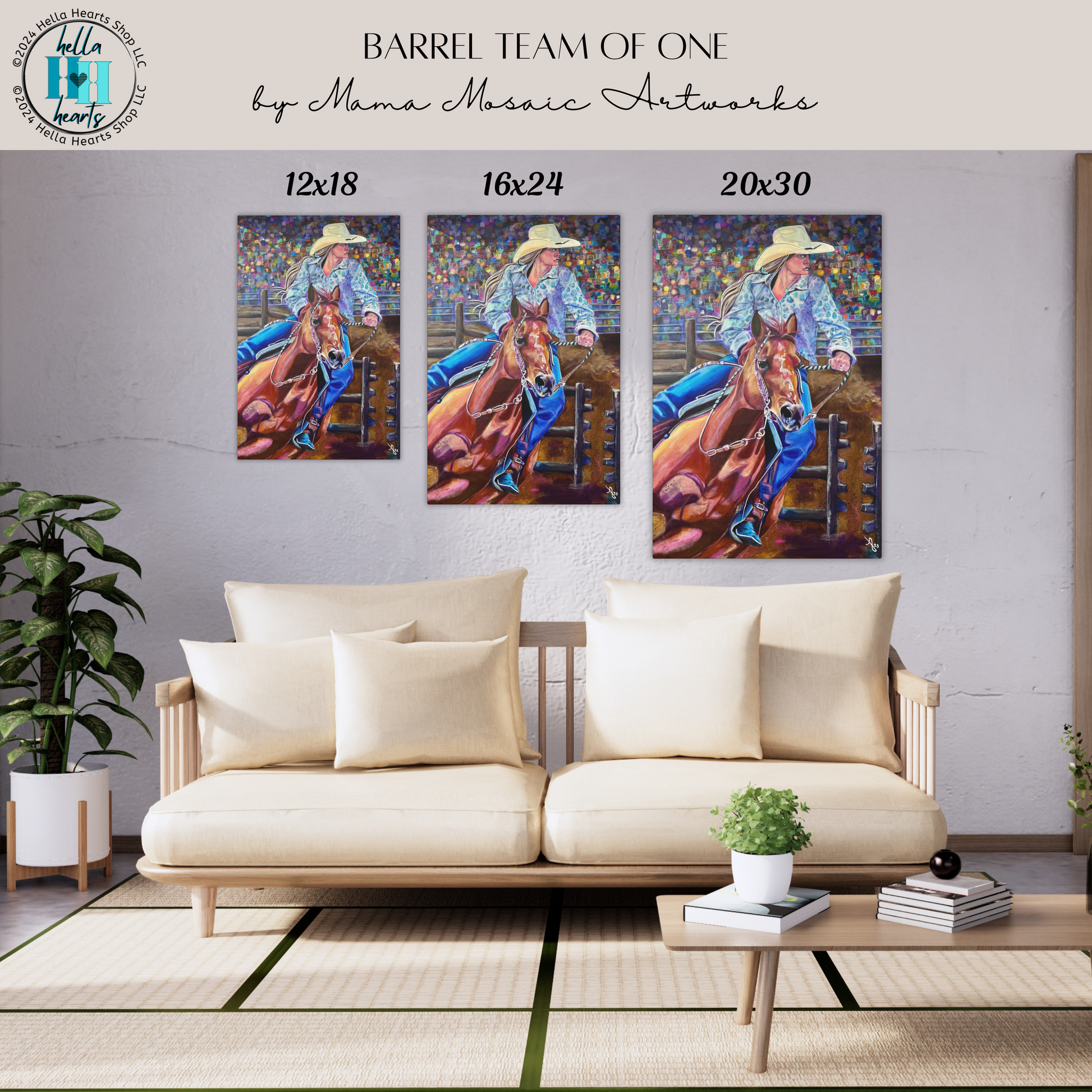 This intriguing canvas is reproduced from the original canvas painting, Barrel Team of One, by Mama Mosaic Artworks. This canvas wall art brings an instant aesthetic to any room. For those who love Western home decor, horses, barrel racing, or who simply love this powerful work of art - get yourself one, or buy it as a gift for a special person in your life!