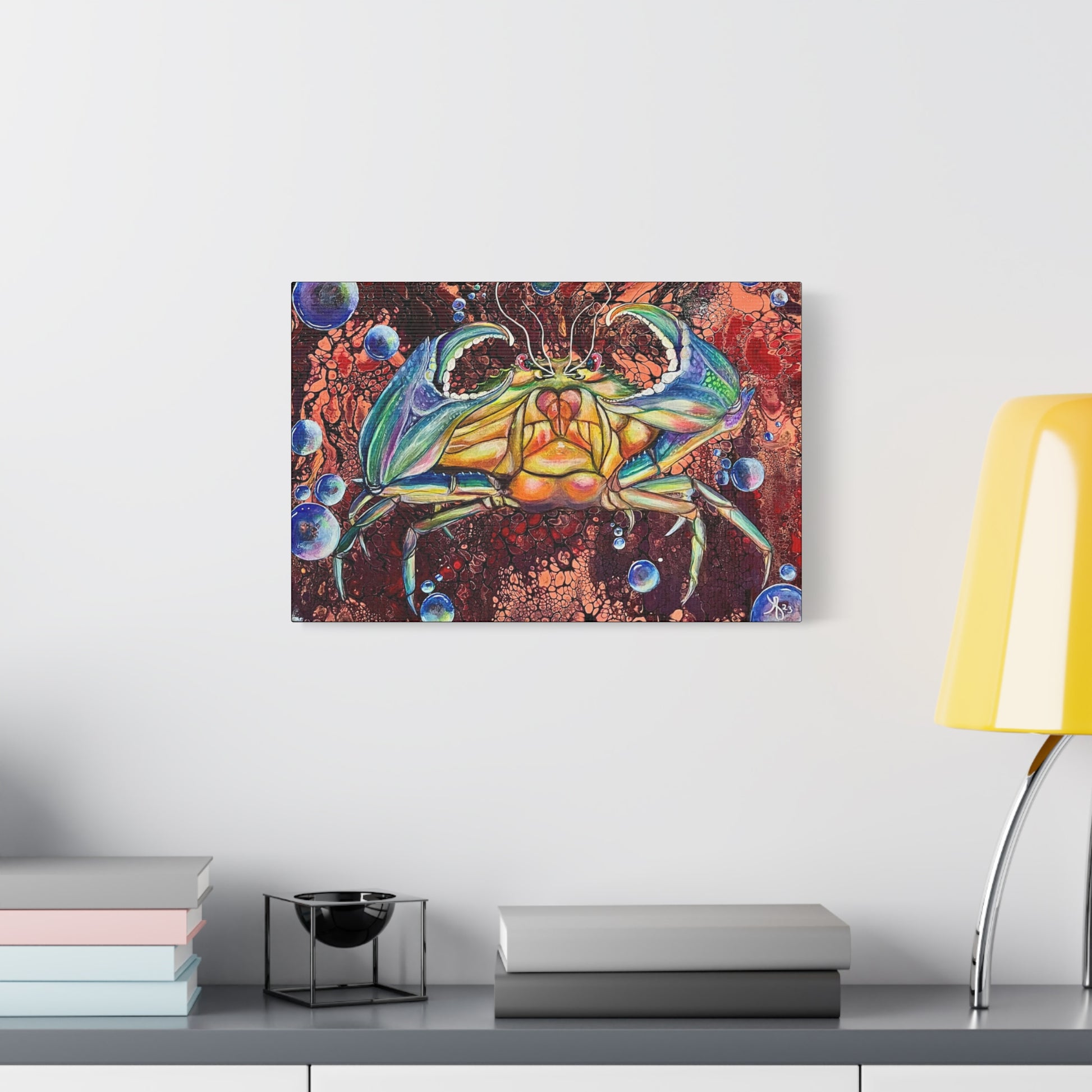 This artwork has been reproduced from the original canvas painting, Crab on a Thermal Vent, by Amy K Bond, co-owner of Hella Hearts Shop. Amy also paints under her studio name, Mama Mosaic Artworks.