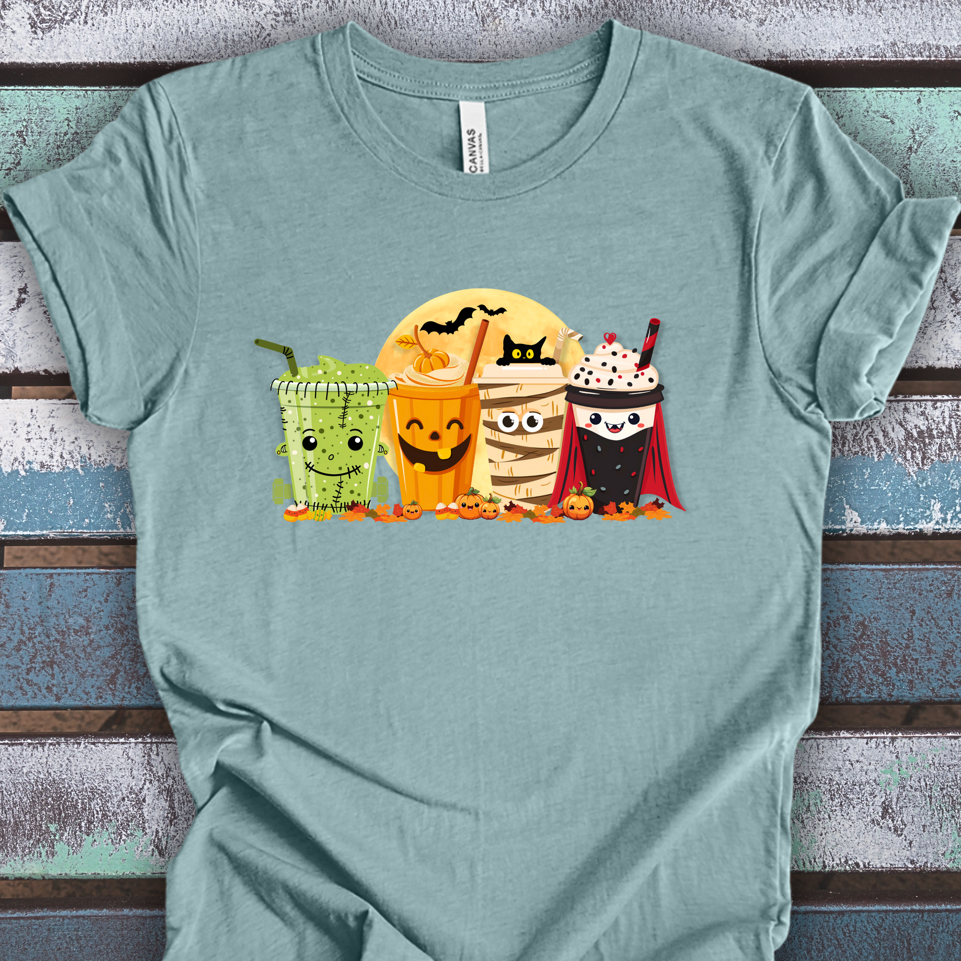 Designed with a love for coffee and Halloween monsters: Frankenstein, Jack-o-lantern, Mummy, and Dracula.