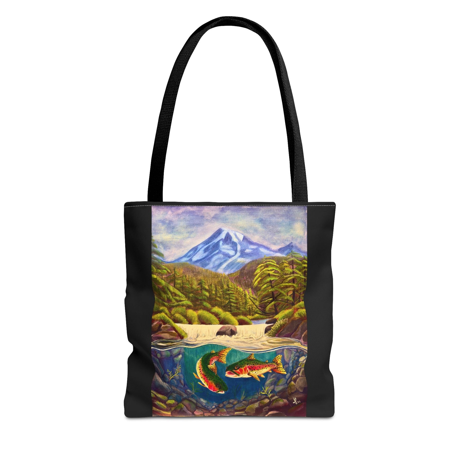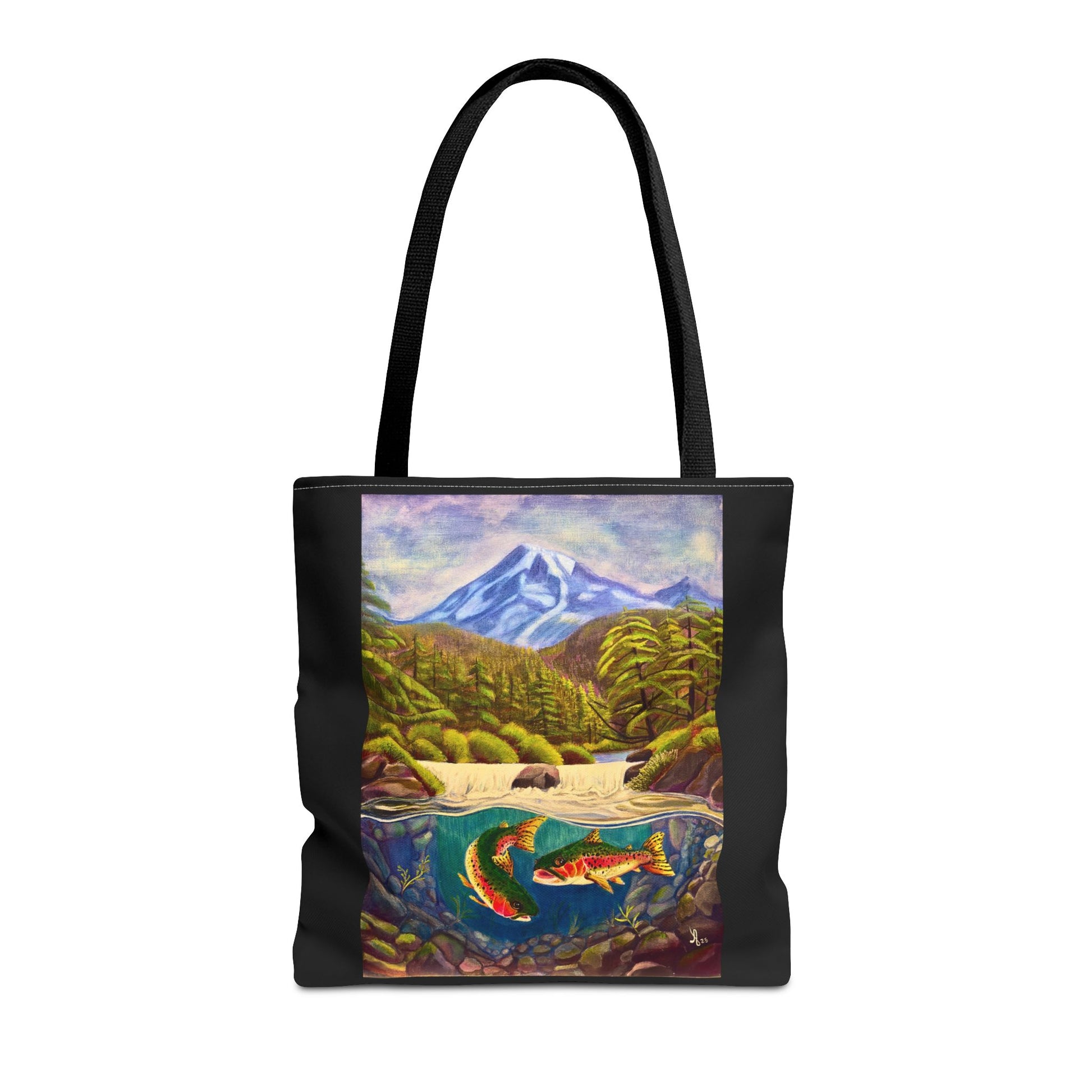 This design is reproduced from the original canvas painting, Mr Rainier and Rainbow Trout, by Amy K Bond of Mama Mosaic Artworks. Made especially for those who love Mt Rainier, fishing, wildflowers, floral paintings, eclectic tote bags, or who simply love this gorgeous piece of art - get one for yourself, or buy it as a gift for a special naturalist in your life!