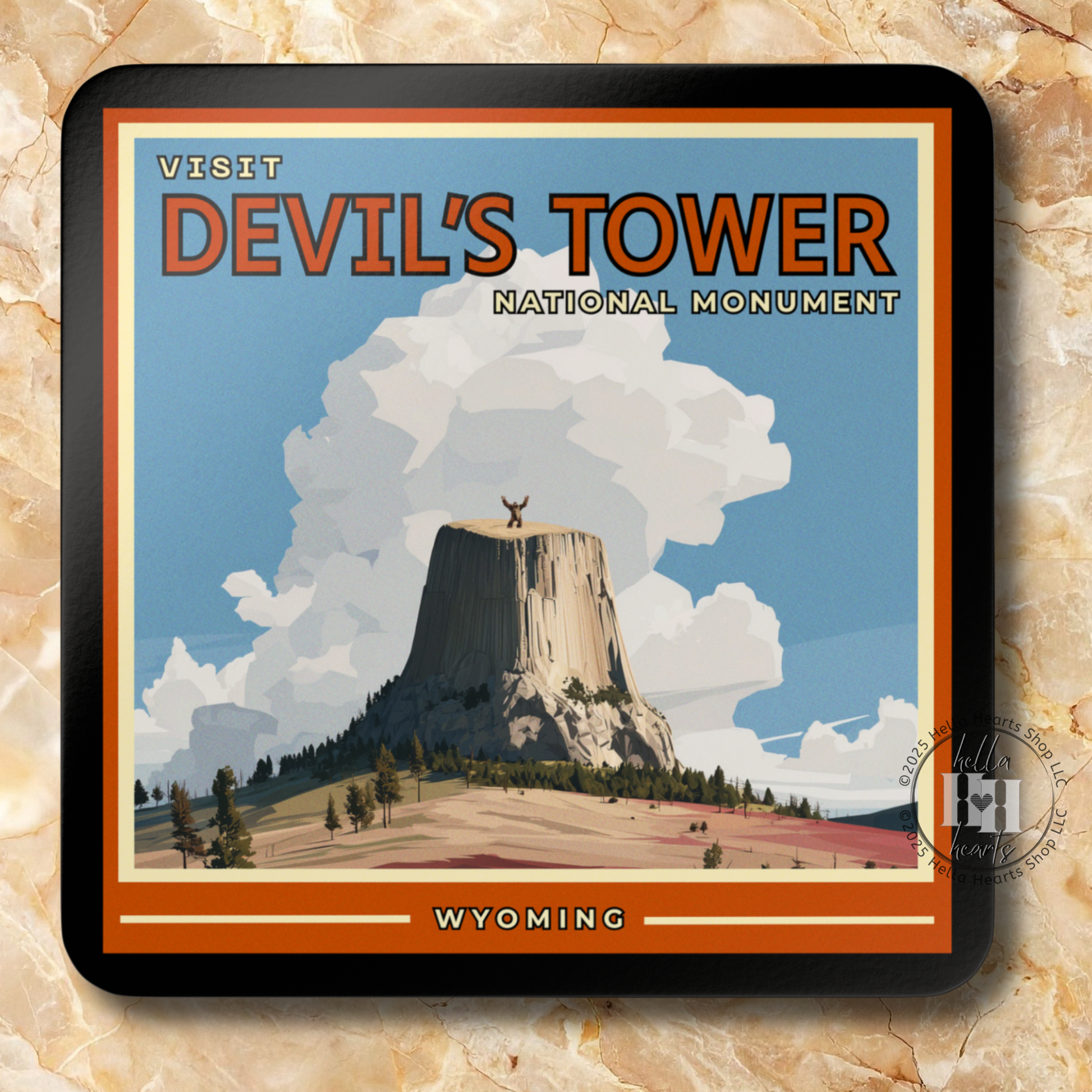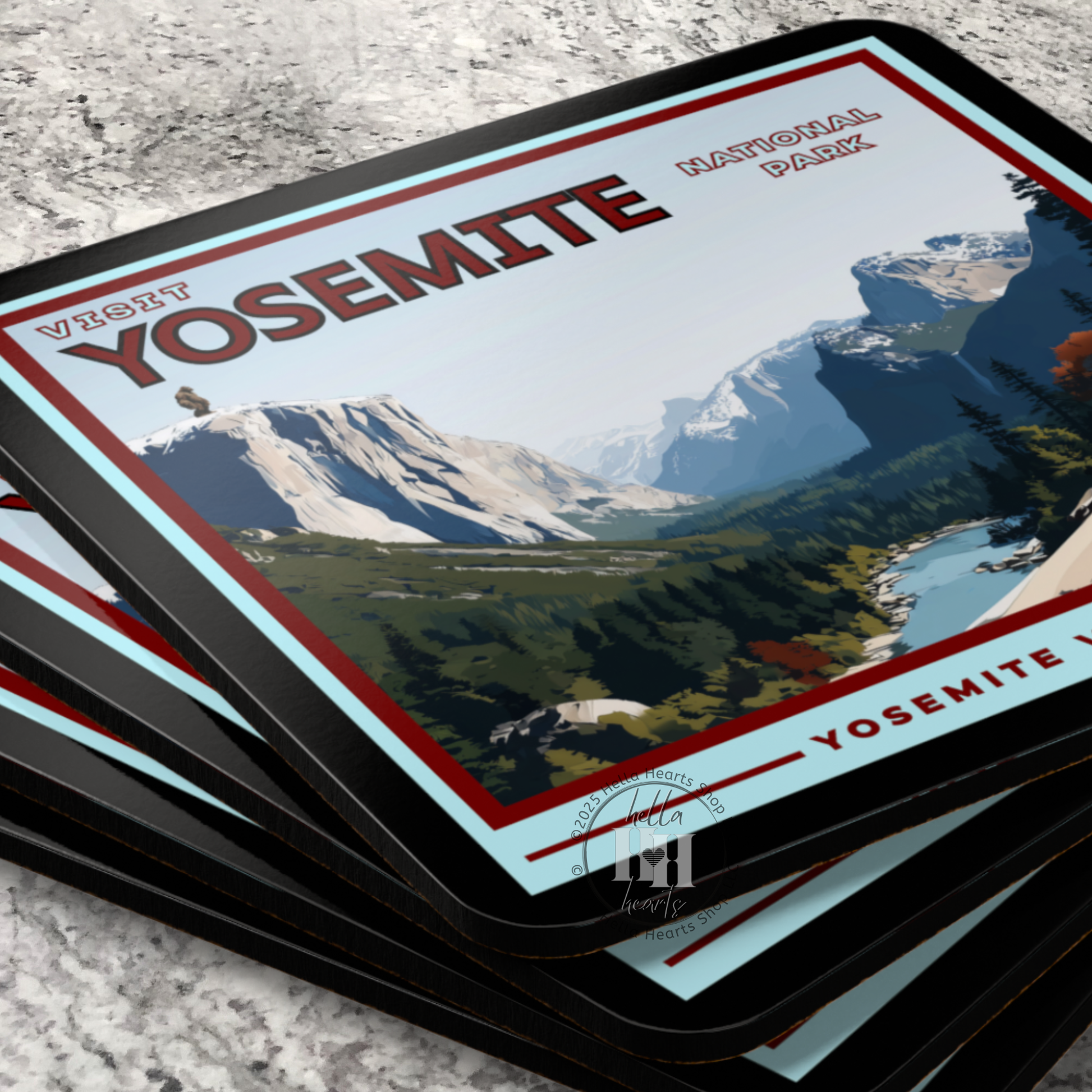 Bring the retro travel vibes of Arches National Park, Yellowstone, Devil's Tower and Yosemite into your home with this vibrant Corkwood Coaster Set featuring a sasquatch in each NPS site. Perfect for those who love unique and colorful home decor, this set is ideal for nature enthusiasts and travelers. Great for gifting during holidays and special occasions.